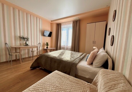 Уютные и просторные двухместные номера с двумя полутораспальными кроватями. Два спальных места.
